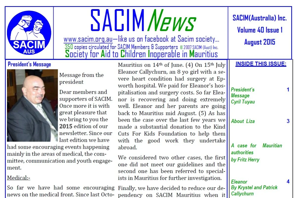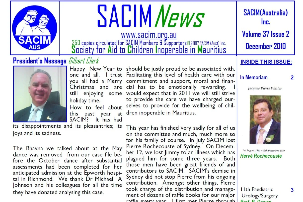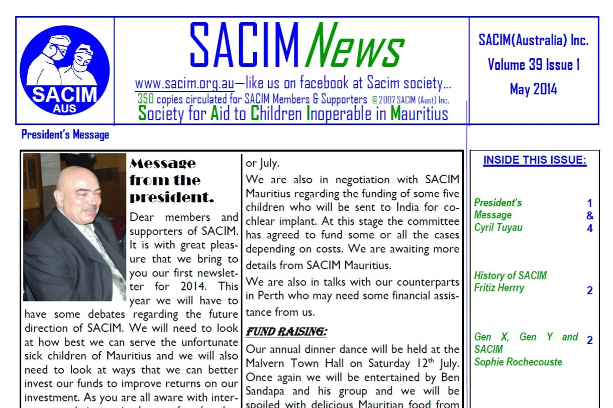Please send articles and/or photographs to be included in the next issue of the SACIM (Aust) Inc. Newsletter. Mail your contribution to SACIM (Aust) Inc. at the address on the Contact Us page, or email to: vicepresident@sacim.org.au. Advertising material also welcomed. Price is $30 AUD (including GST) per year for 3 issues. Community Notices considered for free at the Editor’s Discretion.